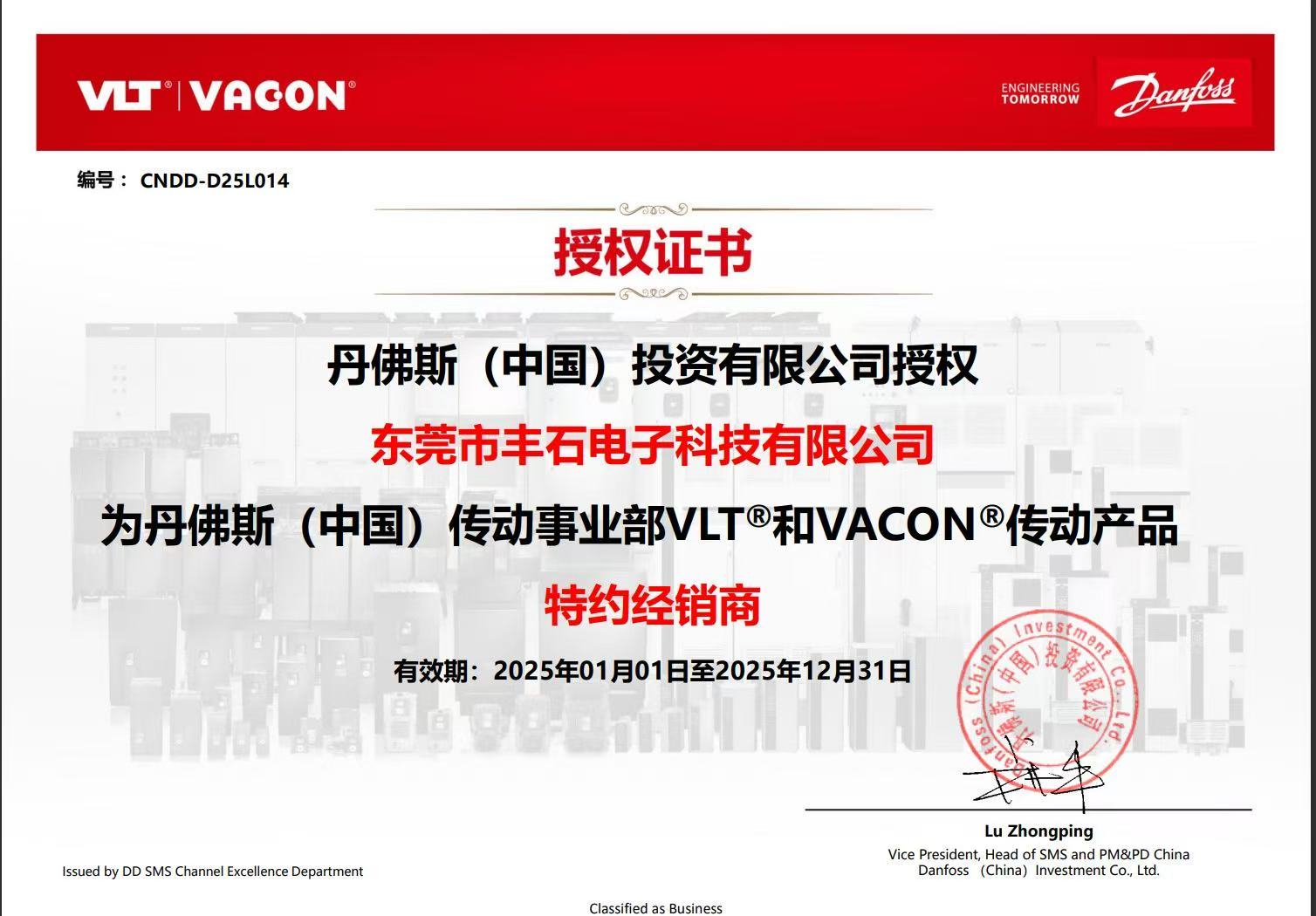 秉承丹佛斯集團(tuán)對(duì)技術(shù)創(chuàng)新與可持續(xù)發(fā)展的卓越追求,我們鄭重宣布:東莞市豐石電子科技有限公司正式獲得丹佛斯(Danfoss)中國區(qū)一級(jí)代理授權(quán)。作為丹佛斯在[具體區(qū)域或行業(yè)領(lǐng)域,如“暖通空調(diào)領(lǐng)域”“工業(yè)自動(dòng)化領(lǐng)域”等] 的戰(zhàn)略合作伙伴,我們將以專業(yè)的技術(shù)實(shí)力、完善的解決方案和高效的本地化服務(wù),助力客戶實(shí)現(xiàn)能效升級(jí)與價(jià)值共贏。